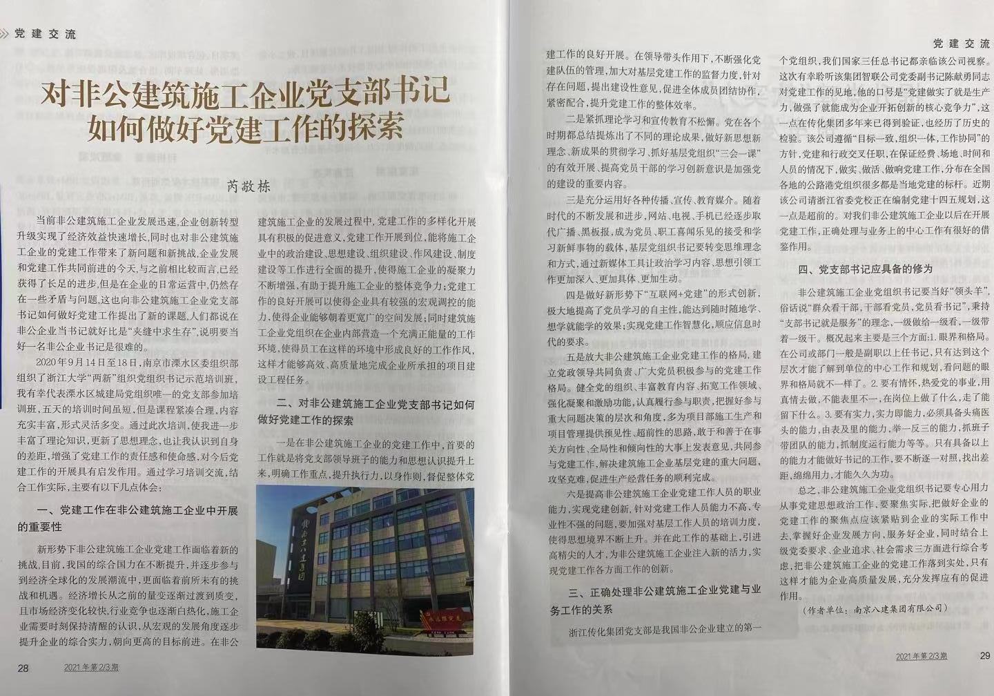 芮敬棟所寫《 對(duì)非公建筑施工企業(yè)黨支部書記 如何做好黨建工作的探索》刊登在2021.2/3《江蘇建筑業(yè)》上 -